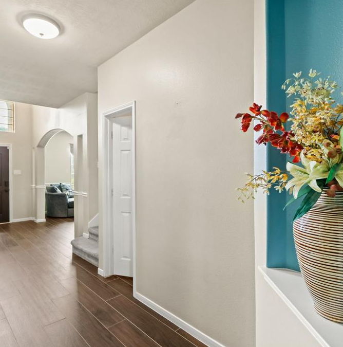 Step into elegance and grandeur as you enter this stunning home's foyer, adorned with high ceilings, beautiful front door, archways, niches, and tiled wod flooring.